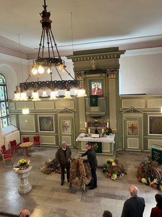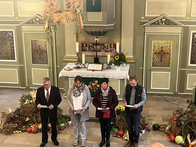 Mit viel Liebe zum Detail war die Kirche geschmückt: Ähren, Kürbisse, Äpfel und Getreidegaben schmückten den Altarraum und erinnerten an die Fülle der heimischen Ernte. Prädikant Andreas Berndt führte durch den Gottesdienst und hielt eine eindrucksvolle Predigt über Dankbarkeit, Verantwortung und Zusammenhalt in herausfordernden Zeiten.